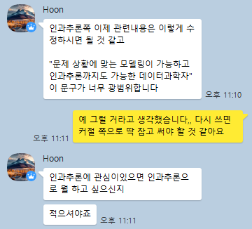 저는 데이터 사이언티스트가 꿈입니다. 데이터사이언티스트라면 딥러닝만 중시할 게 아니라 수리적 이해를 기반으로 상황에 알맞은 모델과 방법론을 선정할 수 있어야 한다고 생각해왔고, 더해 인과추론에 흥미가 있었습니다. 그래서 처음엔 인과추론까지 가능한 멀티플레이어 데이터사이언티스트가 되고 싶다고 적었습니다. 상황에 알맞는 방법을 써야 한다는 말이 너무 포괄적이라서 1번 문항에 이걸 구체적으로 보여줄 수 있는 사례를 적었고요. 사전컨설팅 때는 준비도 열심히 했고 사례를 가져온 것도 칭찬을 받았는데, 점점 갈수록 상황이 꼬였습니다. 초안에서 인과추론의 비중이 너무 낮았고 내가 인과추론을 중요하게 생각한다는 걸 제대로 전달하지 못해서 인과추론을 쳐내라는 피드백이 왔고, 학계서에 자신감이 없던 저는 쌤 하라는 대로만 하자 싶어서 그대로 피드백을 수용해버렸습니다.